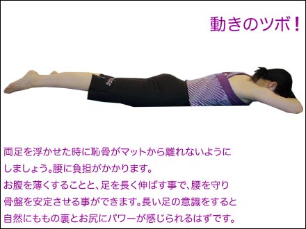 両足を浮かせた時に恥骨がマットから離れないようにしましょう。腰に負担がかかります。お腹を薄くすることと、足を長く伸ばす事で、腰を守り骨盤を安定させる事ができます。長い足の意識をすると、自然にももの裏とお尻にパワーが感じられるはずです。